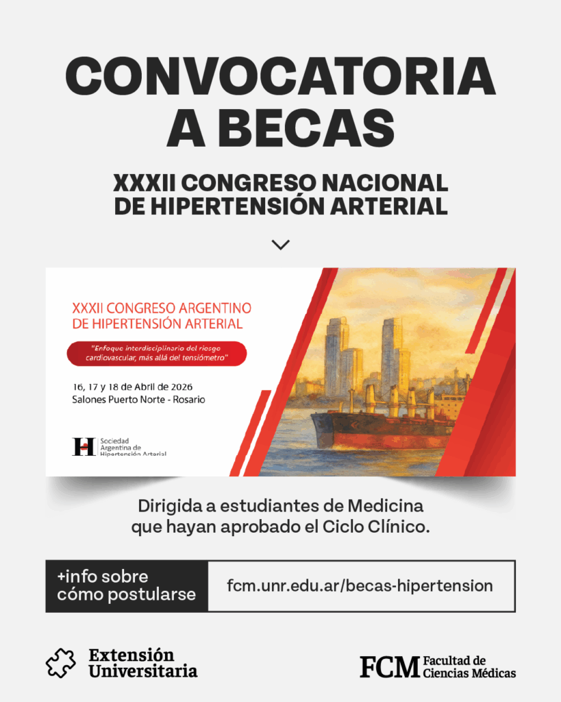 La Secretaría de Extensión de la Facultad de Ciencias Médicas informa que se encuentra abierta la convocatoria para la asignación de 15 becas destinadas a estudiantes de la Carrera de Medicina, para participar del XXXI Congreso Nacional de Hipertensión Arterial, que se desarrollará los días 16, 17 y 18 de abril en la ciudad de Rosario.