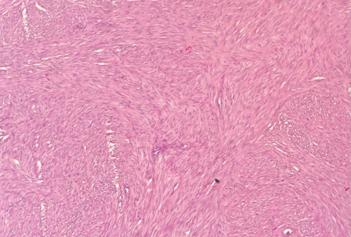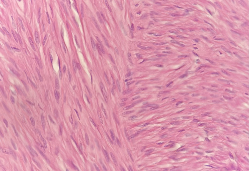 Microscópicamente, el tumor muestra la apariencia típica de un leiomioma. Se encuentran constituídos por células de músculo liso, fusadas, con núcleos alargados o en cigarro, de aspecto monomorfo (Fotos 2 y 3). La actividad mitótica está ausente o es muy baja. La mayoría de los leiomiomas son del tipo convencional, pero pueden observarse tipos celulares, mitóticamente activos, atípicos, mixoides y epitelioides . Las células tumorales forman haces interceptados por 7 tabiques fibrosos que pueden ser anchos y mostrar una hialinización marcada . También pueden estar presentes otros cambios degenerativos observados en los leiomiomas uterinos.