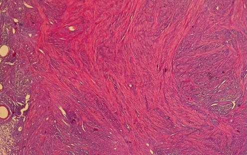 El estudio histológico de la lesión ovárica reveló que la misma se hallaba constituída por una proliferación de músculo liso dispuesta en bandas en diferentes direcciones con ligera hialinización. En la totalidad de los cortes examinados no se reconocieron atipía celular, necrosis, ni actividad mitótica (Fig 2 y 3).