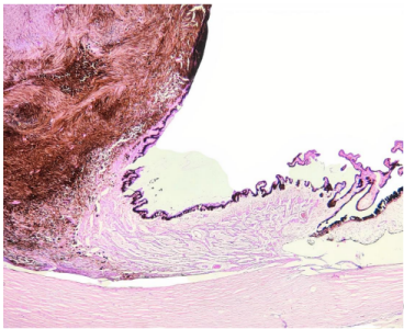 Fig. 2: HE. 100X Cuerpo ciliar y lesión neoplásica.