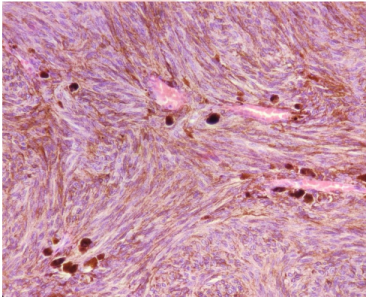 Fig. 3: HE. 400X. Componente neoplásico fusado con carga melánica.