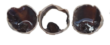 La pieza de enucleación remitida presentaba esclera lisa y blanquecina con presencia, en la región inferior, de una lesión puntiforme pardusca de 0,1 cm de diámetro. Al corte se identificó, en la superficie interna de la cámara posterior, en su región inferior y en contacto con la cara posterior del iris, una lesión fungoide, densa y negruzca de 1,2 cm de diámetro, la cual no compromete nervio óptico, cristalino ni cámara anterior. (Fig. 1)